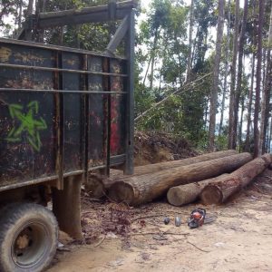Pelaku membuat jalan dari Banjar Tengah menuju kekawasan hutlin Bukit Betabuh dengan alat berat, kayu hutan tersebut dikeluarkan menggunakan truck.