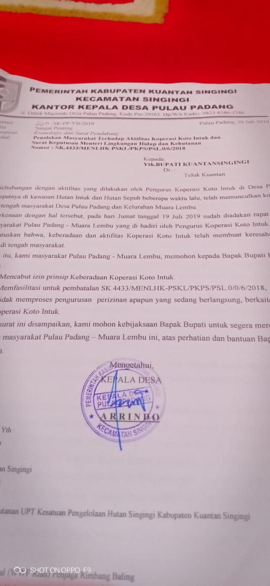 Adapun Nomor surat yang di sampaikan kepada Bupati Kuantan Singingi Nomor:22/SK/PP/VII/2019 tanggal 20 Juli 2019 perihal tersebut diatas dan meminta kepada Bupati Kuantan Singingi agar mencabut izin Prinsip keberadaan koperasi Koto Intuk dan pembatalan SK-nya serta tidak diproses pengurusan perizinan yang berkaitan dengan koperasi Koto Intuk.