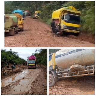 Peristiwa itu terjadi pada hari kamis 11/12/2025 Pukul 14:30 WIB, saat itu lalulintas dalam kondisi ramai terlihat dalam antrin panjang, ada dua mobil truk bermuatan keluar dari badan jalan yang oleng saat melintas di jalan yang licin itu.Tampak juga permukaan jalan berlubang dan dalam kondisi berlumpur.